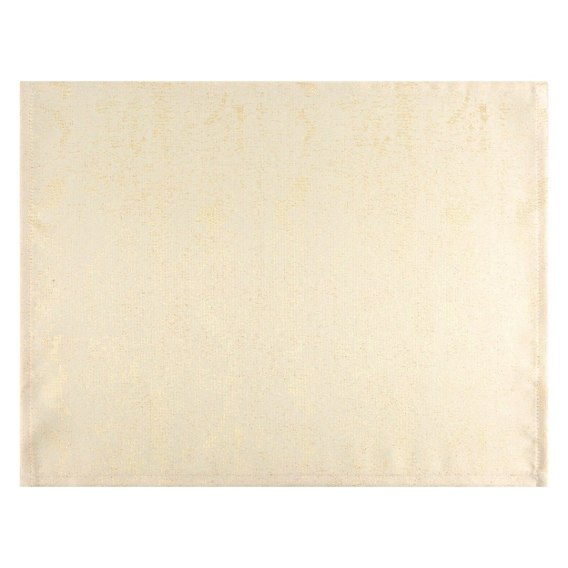 Kremowe podkładki dekoracyjne z delikatnym złotym połyskiem szerokość: 30 cm. długość: 40 cm. kolor: biały. Gramatura: 125 GSM. Skład: 94% poliester. 6% nić metaliczna