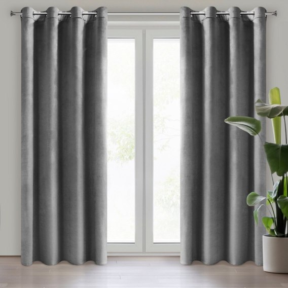 Zasłona welwetowa jednokolorowa szerokość: 140 cm. długość: 250 cm. kolor: stalowy. Gramatura: 200 GSM. Skład: 100% poliester
