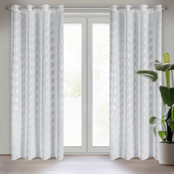 Firana gotowa ze srebrnym nadrukiem szerokość: 140 cm. długość: 250 cm. kolor: biały. Gramatura: 80 GSM. Skład: 100% poliester