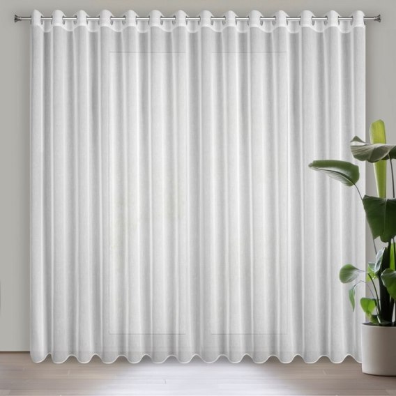 Firana gotowa. jednokolorowa o strukturze drobnego deszczyku szerokość: 300 cm. długość: 250 cm. kolor: biały. Gramatura: 70 GSM. Skład: 100% poliester
