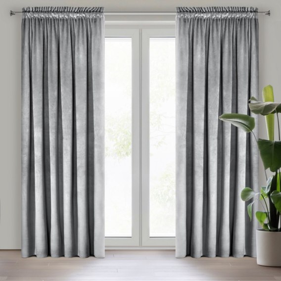 Zasłona welwetowa jednokolorowa szerokość: 140 cm. długość: 270 cm. kolor: srebrny. Gramatura: 200 GSM. Skład: 100% poliester