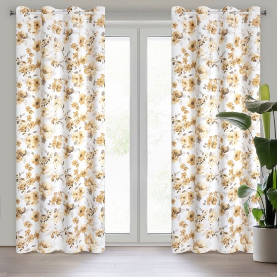 Zasłona zaciemniająca z kwiatowym nadrukiem szerokość: 140 cm. długość: 250 cm. kolor: biały. Gramatura: 210 GSM. Skład: 100% poliester