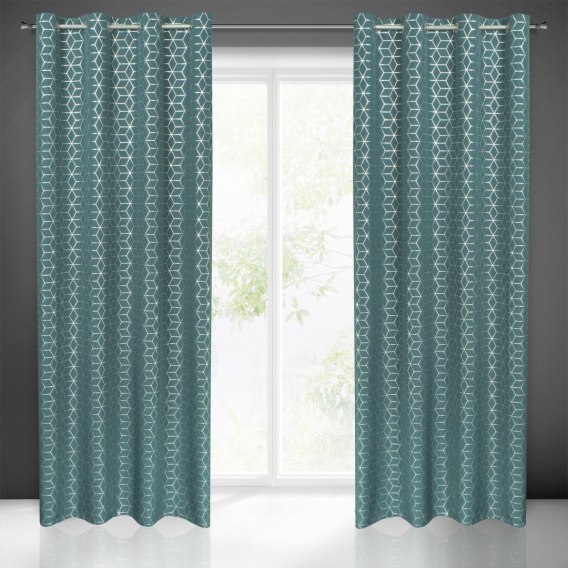 Zasłona oxford na przeloce z geometrycznym srebrnym nadrukiem szerokość: 140 cm. długość: 250 cm. kolor: ciemnoturkusowy. Gramatura: 140 GSM. Skład: 100% poliester