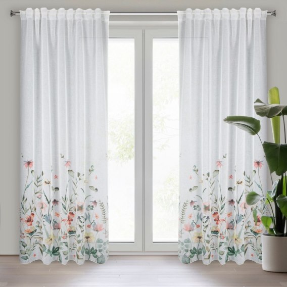 Zasłona z nadrukowanym motywem kwiatowym szerokość: 140 cm. długość: 270 cm. kolor: biały. Gramatura: 70 GSM. Skład: 100% poliester