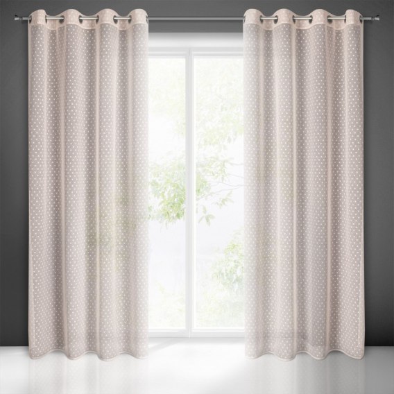 Zasłona gotowa zdobiona groszkami szerokość: 140 cm. długość: 250 cm. kolor: różowy. Gramatura: 75 GSM. Skład: 100% poliester