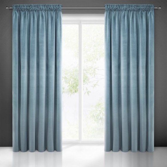 Zasłona welwetowa jednokolorowa szerokość: 140 cm. długość: 270 cm. kolor: jasnoniebieski. Gramatura: 330 GSM. Skład: 100% poliester