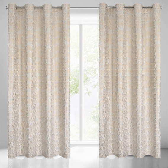 Zasłona welwetowa ze złotym i srebrnym nadrukiem szerokość: 140 cm. długość: 250 cm. kolor: kremowy. Gramatura: 200 GSM. Skład: 100% poliester