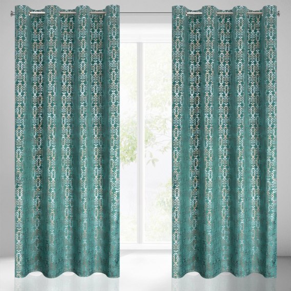 Zasłona welwetowa ze złotym i srebrnym nadrukiem szerokość: 140 cm. długość: 250 cm. kolor: turkusowy. Gramatura: 200 GSM. Skład: 100% poliester