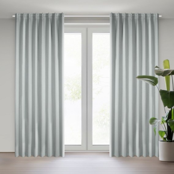 Zasłona zaciemniająca jednokolorowa z taśmą do szyn sufitowych szerokość: 140 cm. długość: 300 cm. kolor: srebrny. Gramatura: 210 GSM. Skład: 100% poliester