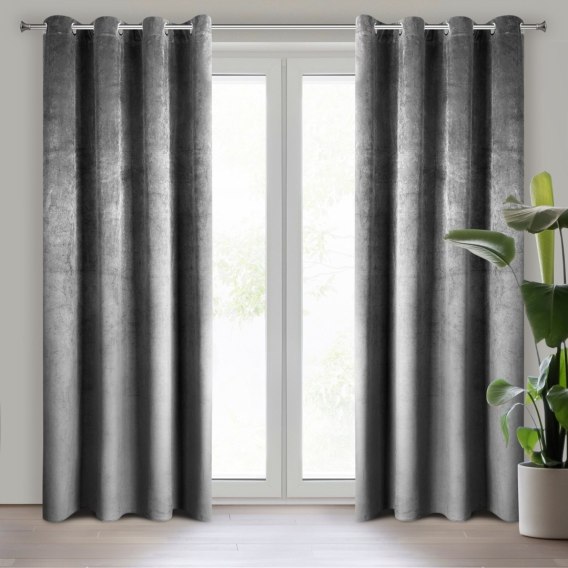 Miękka zasłona gotowa z jednokolorowego aksamitu o charakterystycznym dla welwetu połysku. Mięsista tkanina daje wysoki stopień zaciemnienia wnętrza. szerokość: 140 cm. długość: 250 cm. kolor: stalowy. Gramatura: 215 GSM. Skład: 100% poliester