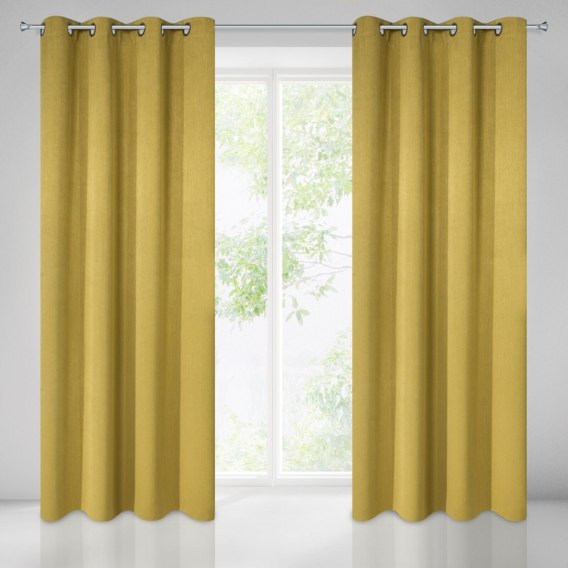 Zasłona zaciemniająca jednokolorowa strukturalna typu blackout szerokość: 140 cm. długość: 250 cm. kolor: musztardowy. Gramatura: 250 GSM. Skład: 100% poliester