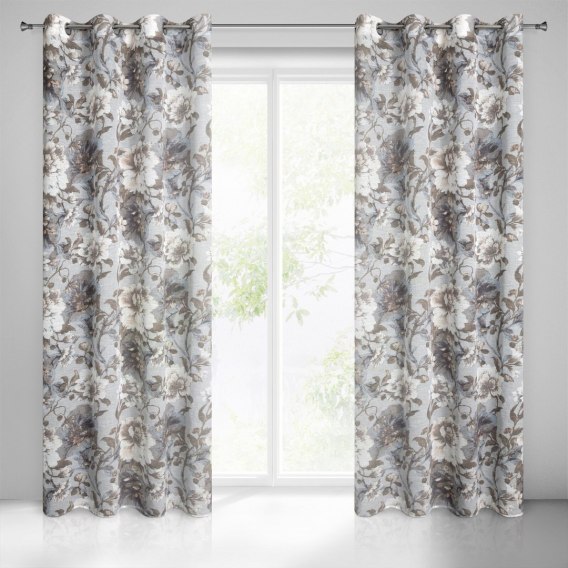 Zasłona w stylu eco z kwiatowym nadrukiem szerokość: 140 cm. długość: 250 cm. kolor: popielaty. Gramatura: 110 GSM. Skład: 100% poliester