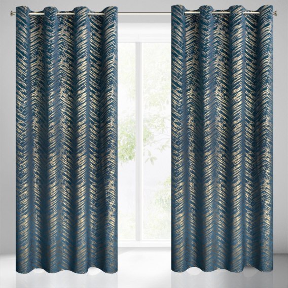 Zasłona welwetowa ze złotym nadrukiem szerokość: 140 cm. długość: 250 cm. kolor: granatowy. Gramatura: 200 GSM. Skład: 100% poliester