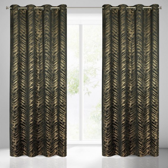 Zasłona welwetowa ze złotym nadrukiem szerokość: 140 cm. długość: 250 cm. kolor: czarny. Gramatura: 200 GSM. Skład: 100% poliester