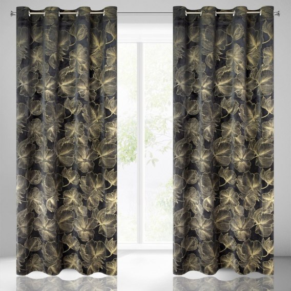Zasłona welwetowa ze złotym nadrukiem szerokość: 140 cm. długość: 250 cm. kolor: czarny. Gramatura: 200 GSM. Skład: 100% poliester